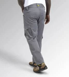 Pantalone in twill stretch poliestere, cotone ed elastane con tasche porta ginocchiere, tasca laterale, dettagli rifrangenti, tasca portametro, portamartello, elastico in vita, tripla cucitura. Contrasti in canvas antiabrasione.